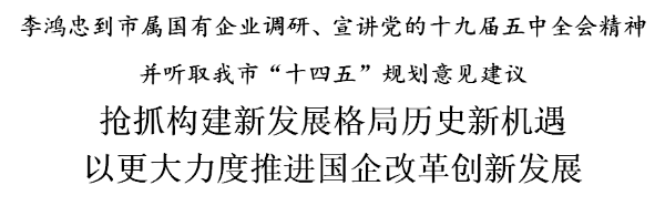 本报讯(记者 魏彧 于春沣)17日,市委书记李鸿忠深入市属国有企业调研、宣讲党的十九届五中全会精神,并听取我市“十四五”规划意见建议。李鸿忠强调,要坚持以习近平新时代中国特色社会主义思想为指导,认真学习贯彻党的十九届五中全会精神,深入贯彻新发展理念,抢抓构建新发展格局历史新机遇,找准自身定位,毫不动摇巩固和发展公有制经济,以更大的力度推动国企改革创新发展,切实促进国有企业不断做强做优做大。