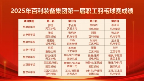 本次羽毛球比赛的成功举办,不仅丰富了职工的业余生活,增强了职工的身体素质,更为广大职工搭建了展示自己、相互交流、切磋球技的平台。职工们纷纷表示,将把赛场上的拼搏精神、协作意识投入到工作中,勇争先、善作为、多贡献,为百利装备集团建设世界一流装备制造企业贡献力量!
